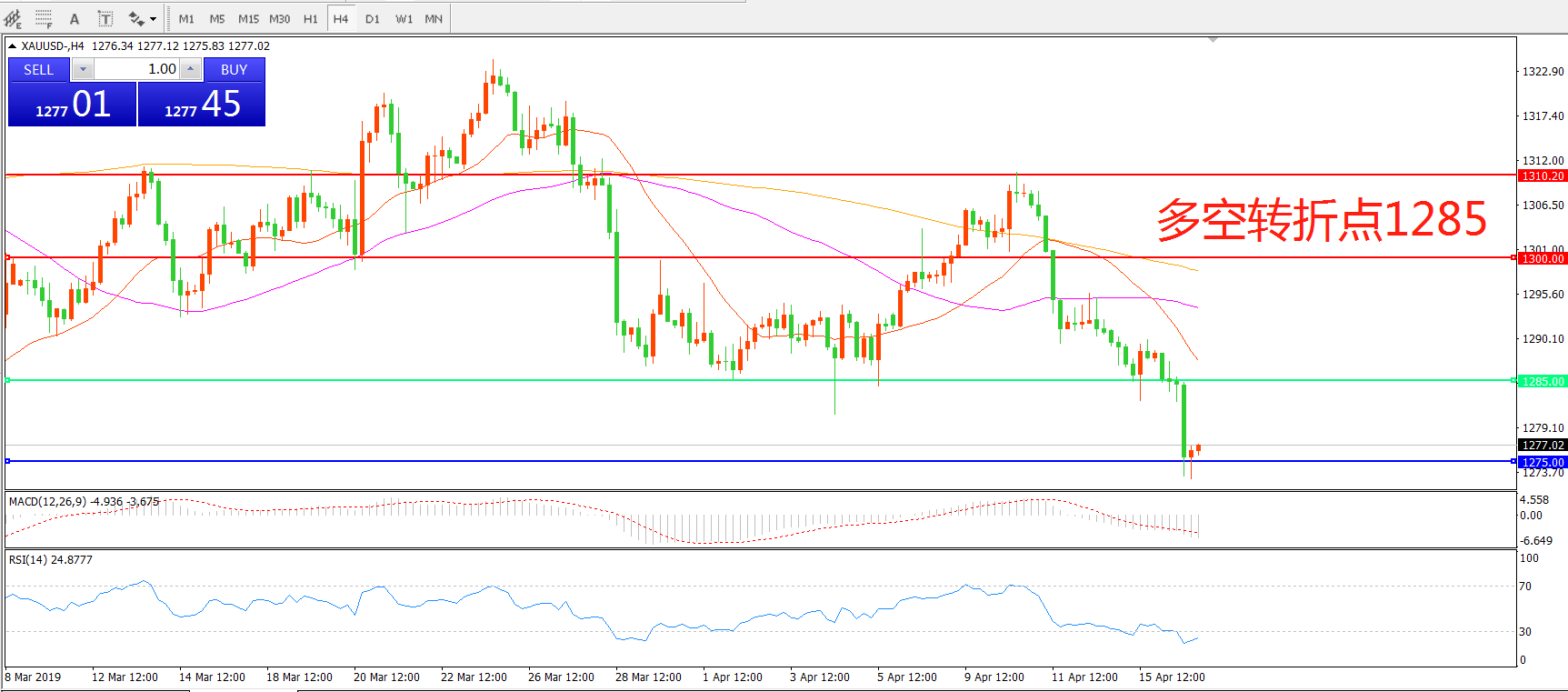 4小时图看,金价跌破1285一线后连续下行,短期走势疲态尽显,均线系统呈空头排列,MACD绿柱增加,日内以空头思路为主。