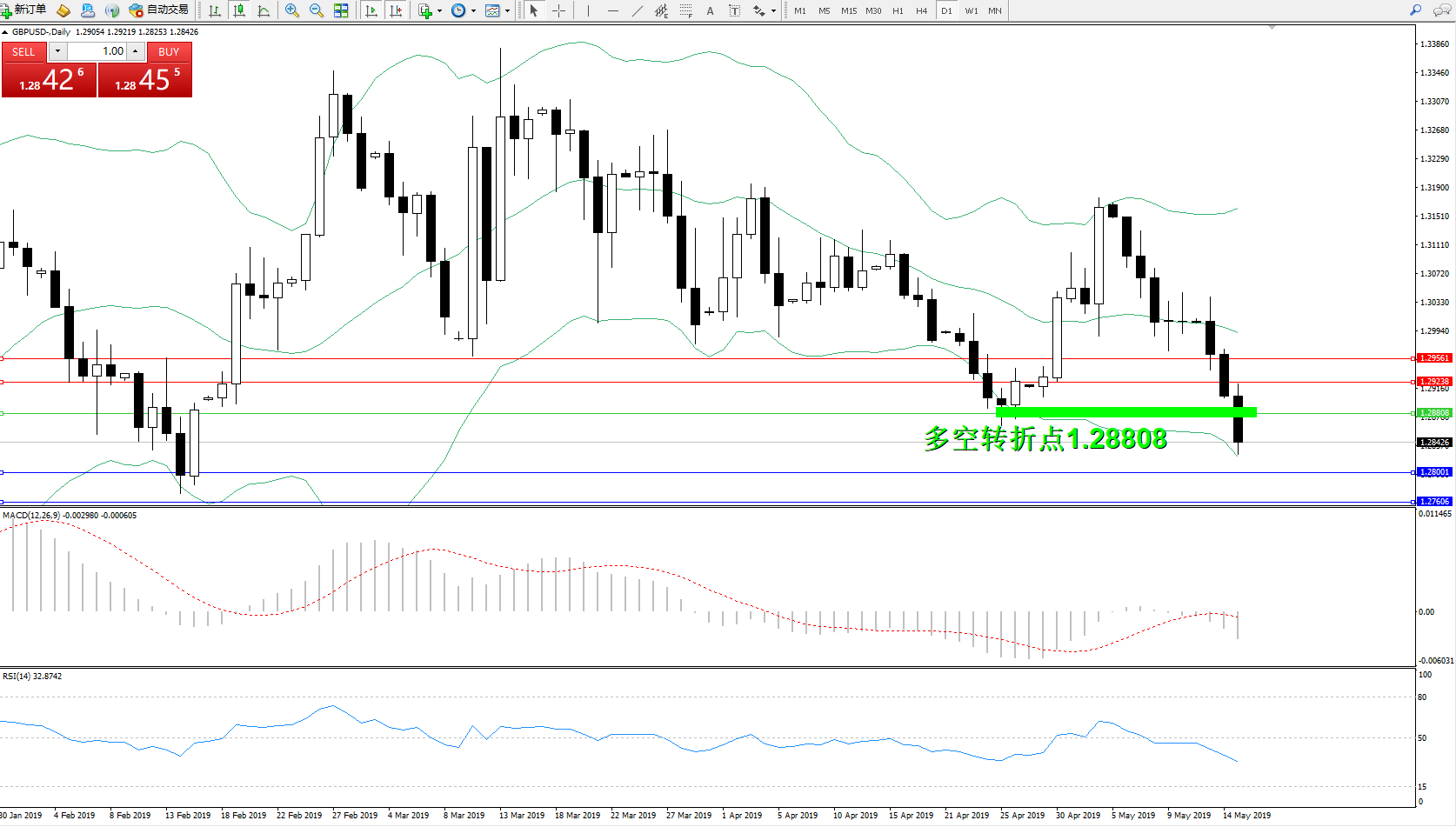 交易策略:1.28808下方看跌,目标1.28001、1.27606