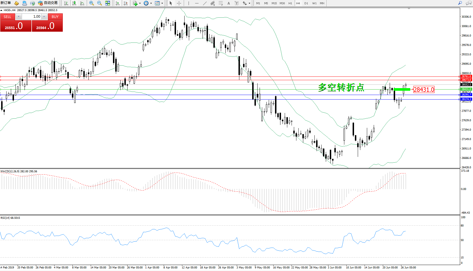 香港恒生指数6月27日(周四)收盘上涨399.44点,涨幅1.42%,报28621.42点;昨晚夜期受惠好消息,最多升超过222点。港股早上延续升势,高开130点,并逐步扩大升幅,最多升311点,恒指高见28526。市场预期在日本会议完毕,谈判气氛会进一步缓和。后市来看,股指本周最后两个交易日应有一次变盘走势来临,投资者需做好中阴或中阳的两手准备,最迟在下周初给出方向,G20消息面决定技术面的突破方向选择。