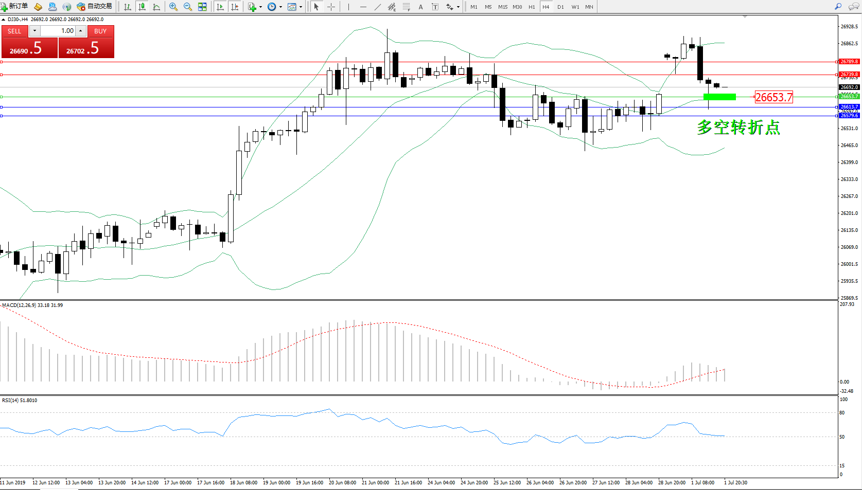 道琼斯指数DJ30—— 4小时K线图显示: