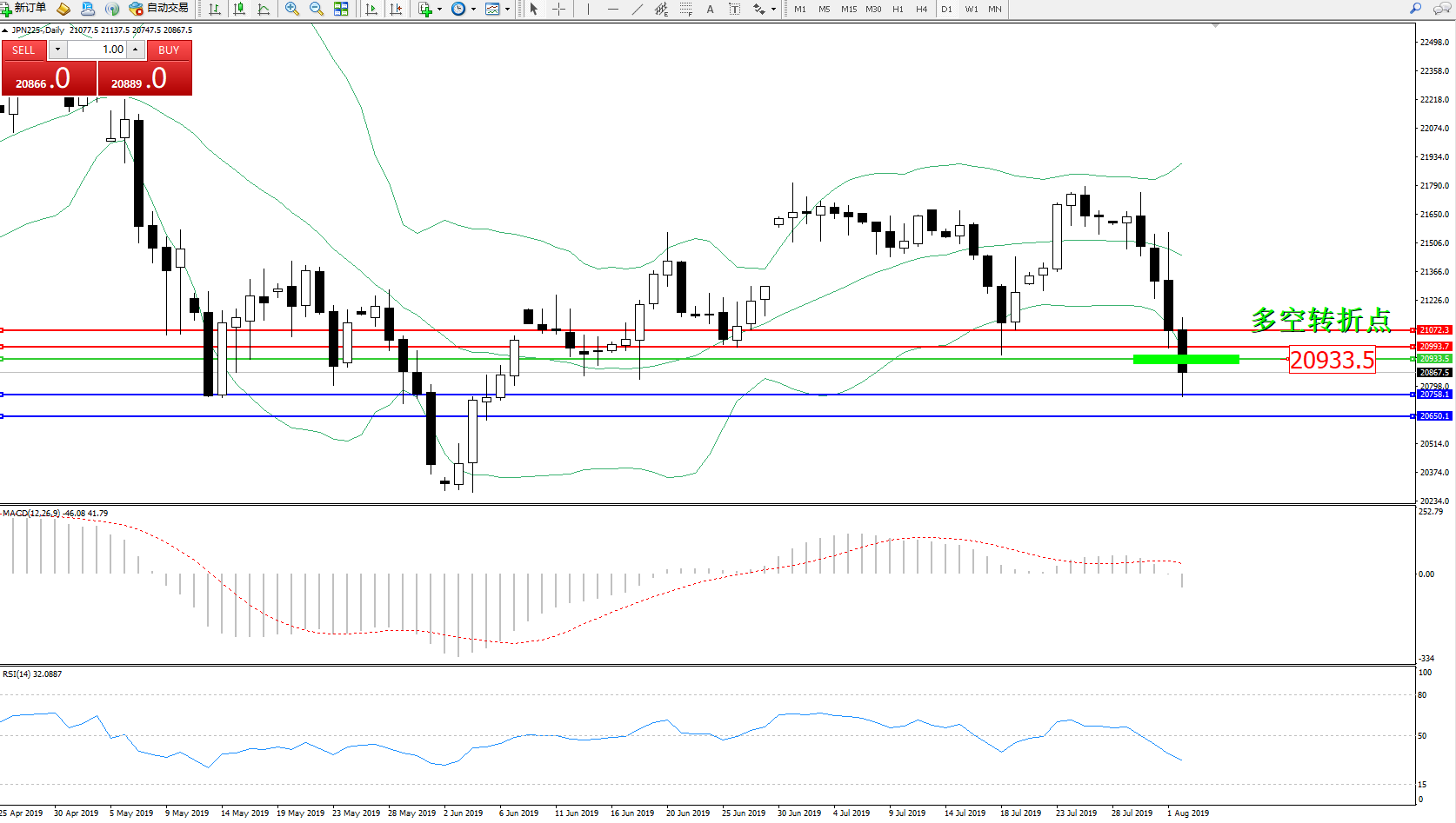 日经225指数8月2日(周五)收盘下跌483.99点,跌幅2.25%,报21057.00点。特朗普将从9月1日起对价值3000亿美元的中国商品加征10%的关税,引发全球股市重挫,日本央行会议纪要显示:央行应该利用当前宽松货币政策达成物价稳定目标,同时要更加密切关注负作用。必须坚持考虑可持续的宽松政策。在外部环境变化的时候,比如美国与欧洲货币政策宽松预期愈加增长的时候,央行需要加强货币宽松政策。