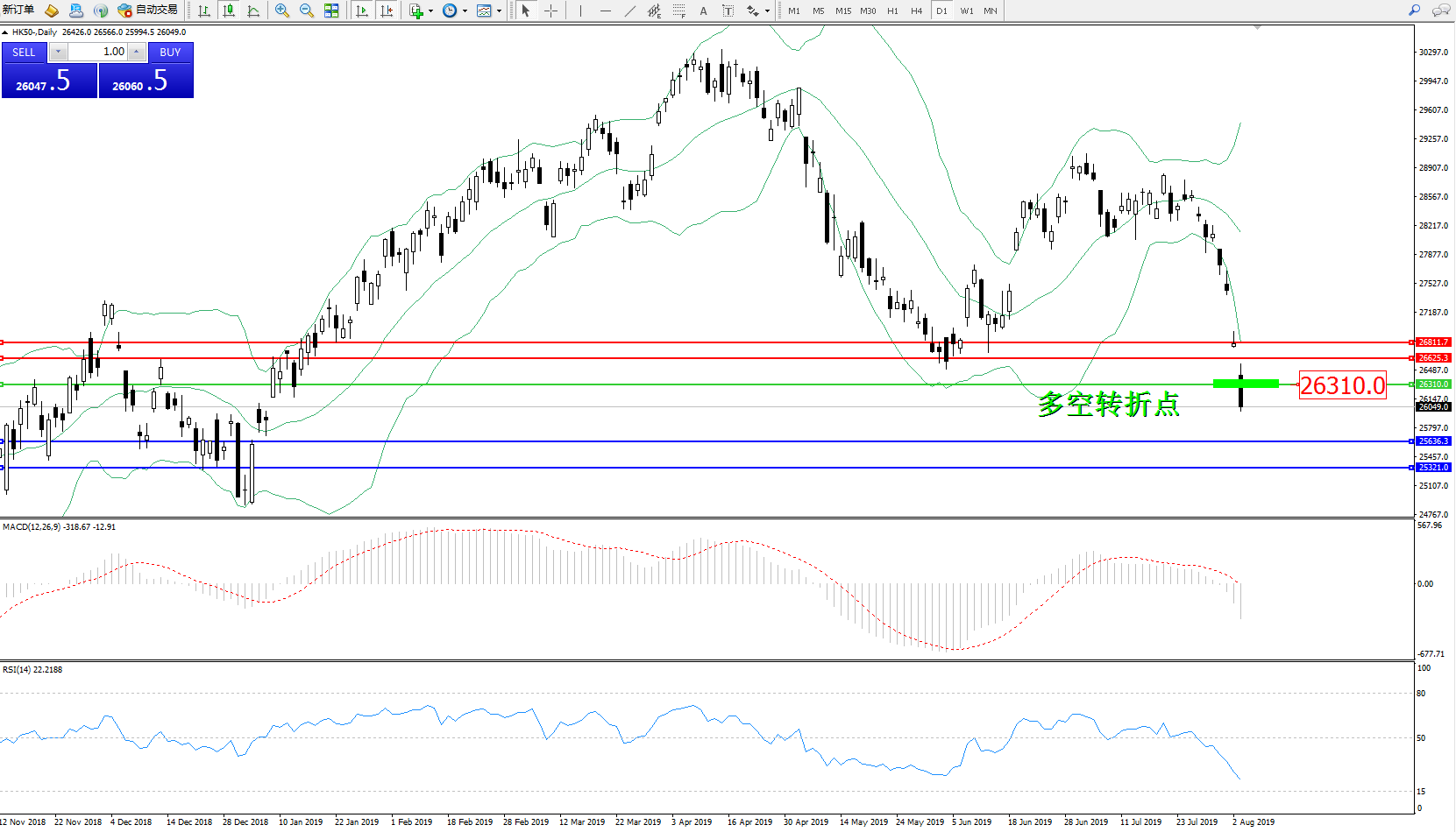 香港恒生指数8月5日(周一)收盘下跌767.26点,跌幅2.85%,报26151.32点;恒指自7月4日创下阶段性新高以来,接连失守多个整数关口,创下今年二月至今新低。香港7月采购经理指数(PMI)由6月47.9的水平进一步跌至43.8,创2009年3月后新低,并且连续16个月低于荣枯线50的水平,反映香港经济活动连续处于收缩状态。林郑月娥称,暴徒“玉石俱焚”做法推香港上不归路。