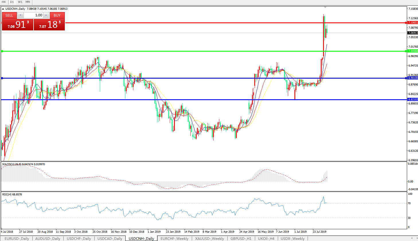 在岸人民币周三(87)再度收跌近百点,至7.04上方,中间价则再跌逾300点逼近7元关口,两者同创逾11年新低。交易员称,市场继续消化此前全面贸易环境波动所带来的冲击,但央行发行离岸央票,打破了离岸带动在岸下跌的反馈机制,加之近两日长端掉期大行卖压较重,均缓和了人民币跌势,市场情绪总体平稳,短期料维持在7.05附近宽幅波动。交易员并表示,人民币此轮下跌是基本面驱动的顺势调整,如果此后有利多的消息出现,不排除人民币再进入6时代,如此一来整数关口的心理意义将会被进一步淡化。如果欧美时段美指保持基本稳定,明日中间价很可能会站上7,但对市场情绪的影响总体可控,指标性程度已被淡化。中国外管局最新公布的外储数据显示,7月末外储结束两连升,当月下降155亿美元,为九个月最大单月降幅。外管局发言人称,7月中国外汇市场运行保持平稳,外储规模变动主要受汇率折算和资产价格变化等因素综合影响。