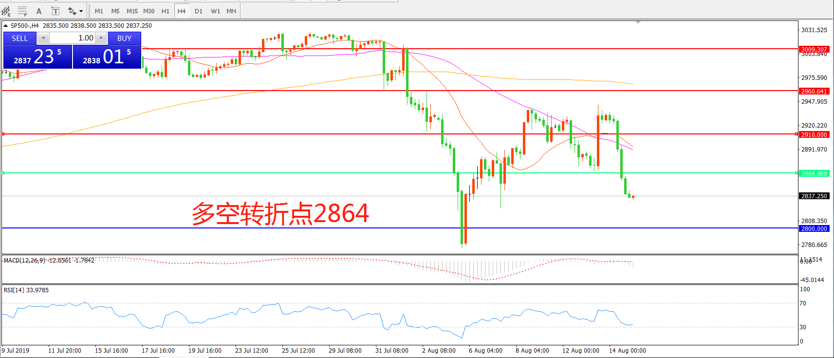 周三(8月14日),美国2年期和10年期国债收益率曲线自2007年来首次出现倒挂,引发市场对美国经济即将陷入衰退的担忧。在战后的9次衰退中,利率倒挂成功预示了7次,准确度达到近78%,是个相当高的纪录。因此,如果两者开始反转,预期经济将在一年内陷入衰退。受此影响,三大股指悉数下跌,标普500前日涨幅被全部吞没,最终收报2836.75点。