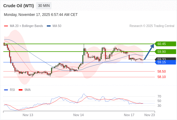 在 59.15 之上,看涨,目标价位为 59.90 ,然后为 60.45 。