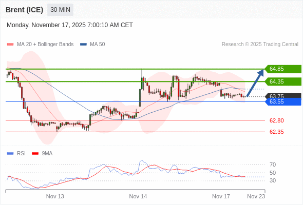 在 63.55 之上,看涨,目标价位为 64.35 ,然后为 64.85 。