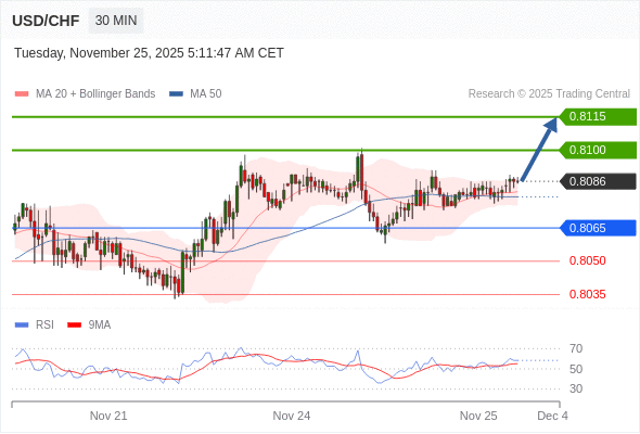 在 0.8065 之上,看涨,目标价位为 0.8100 ,然后为 0.8115 。