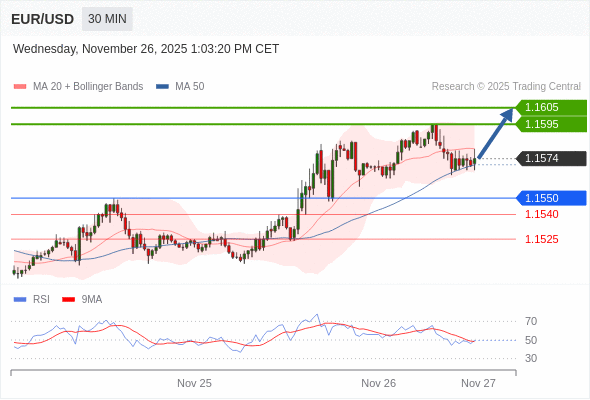 在 1.1550 之上,看涨,目标价位为 1.1595 ,然后为 1.1605 。