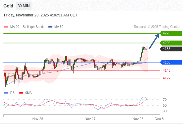 交易策略: 在 4160 之上,看涨,目标价位为 4200 ,然后为 4220 。