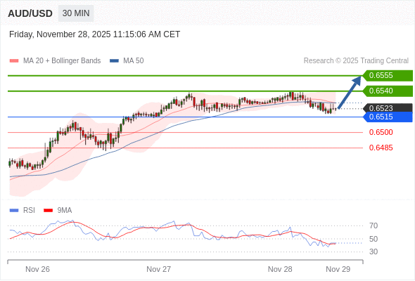 在 0.6515 之上,看涨,目标价位为 0.6540 ,然后为 0.6555 。