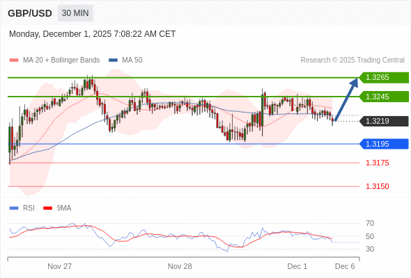 在 1.3195 之上,看涨,目标价位为 1.3245 ,然后为 1.3265 。