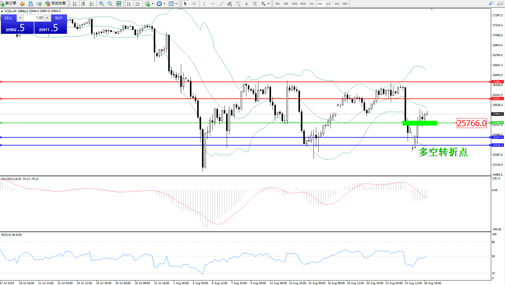 道琼斯指数826日(周一)收盘上涨269.90点,涨幅1.05%,报25898.83点。因特朗普关于贸易问题的乐观评论鼓舞了市场风险偏好。国际贸易关系有所进展的消息提振了市场情绪。市场仍在关注本周美国GDP等数据,以进一步研判美国经济衰退的可能性。,此外,美国7月耐用品订单数据和8月达拉斯联储制造业指数强于预期提振了美元,特朗普表示美国“非常接近”与欧盟达成可能的贸易协议。