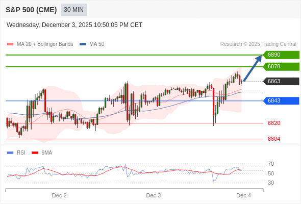 在 6843 之上,看涨,目标价位为 6878 ,然后为 6890 。