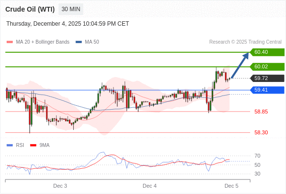 在 59.41 之上,看涨,目标价位为 60.02 ,然后为 60.40 。