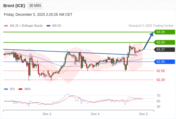 在 62.90 之上,看涨,目标价位为 63.65 ,然后为 64.05 。