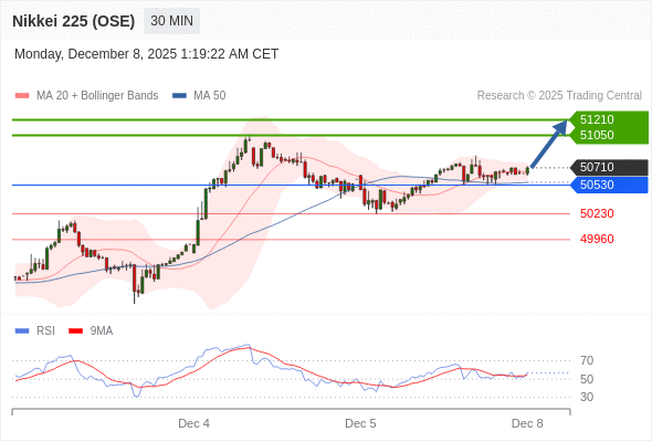 在 50530 之上,看涨,目标价位为 51050 ,然后为 51210 。