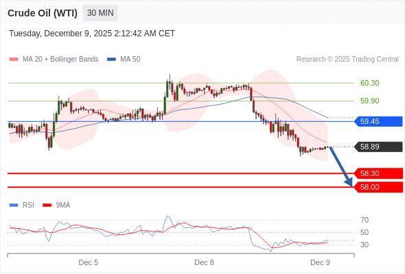 在 59.45 之下,看跌,目标价位为 58.30 ,然后为 58.00 。