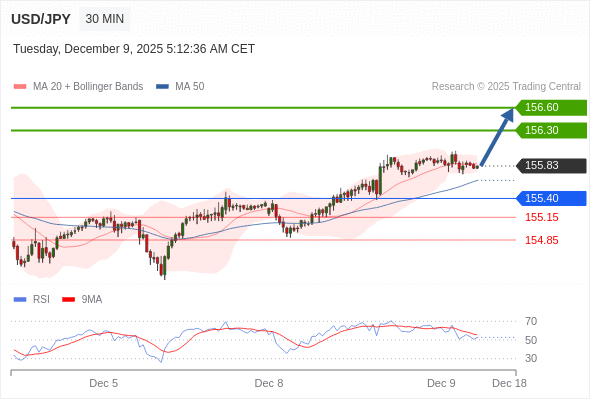 在 155.40 之上,看涨,目标价位为 156.30 ,然后为 156.60 。
