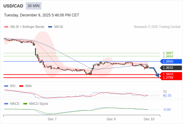 美元/加元 当日内 : 看跌,在 1.3860 之下。