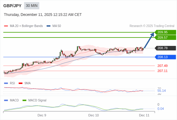 英镑/日元 当日内 : 看涨,当 208.13 为支撑位。