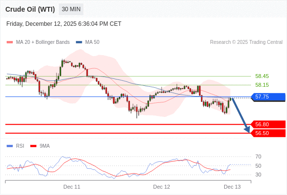 在 57.75 之下,看跌,目标价位为 56.80 ,然后为 56.50 。