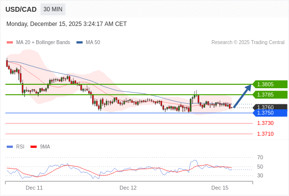 在 1.3750 之上,看涨,目标价位为 1.3785 ,然后为 1.3805 。