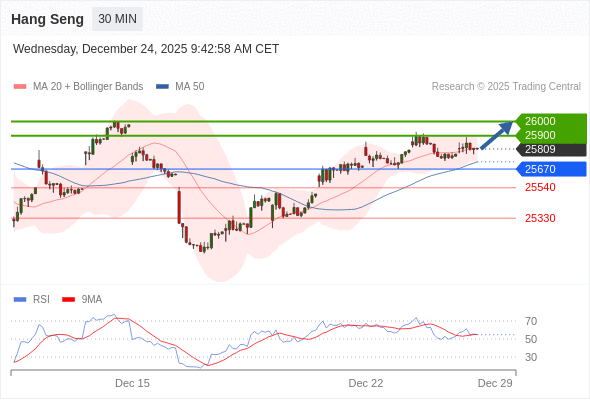 恒生指数 当日内: 在25670之上,看涨。