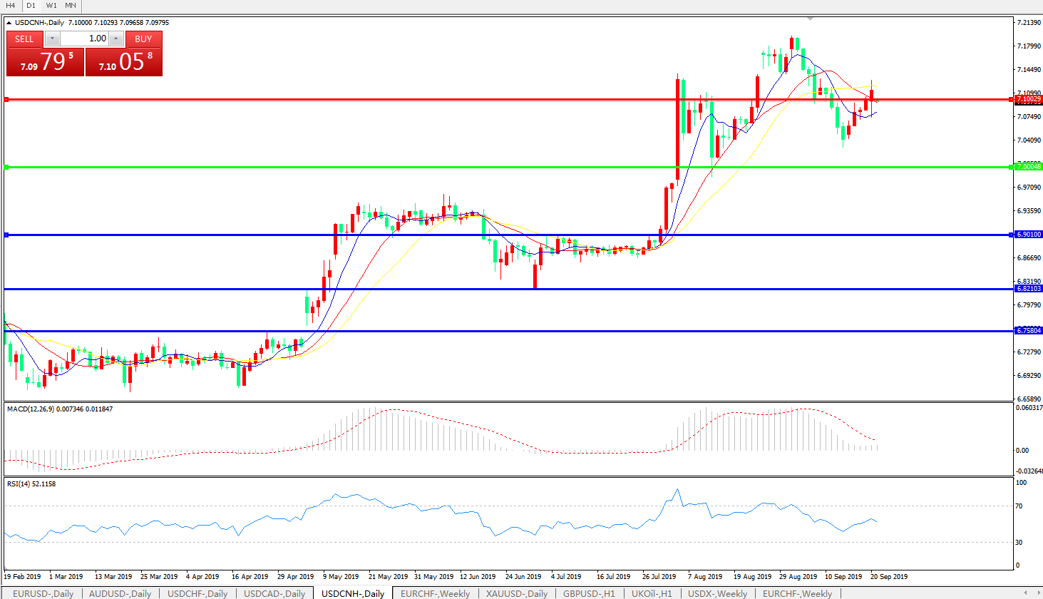 技术面简析:日图均线整体呈下行态势但短期均线拐头,汇价击穿7.10关口显现强势,MACD逼近0轴且动能有再度放量迹象,RSI延续走高态势,预计短期汇价将延续上行态势,上方重点关注7.20-7.30区间的压制;近期中美贸易谈判略有进展,须持续关注。