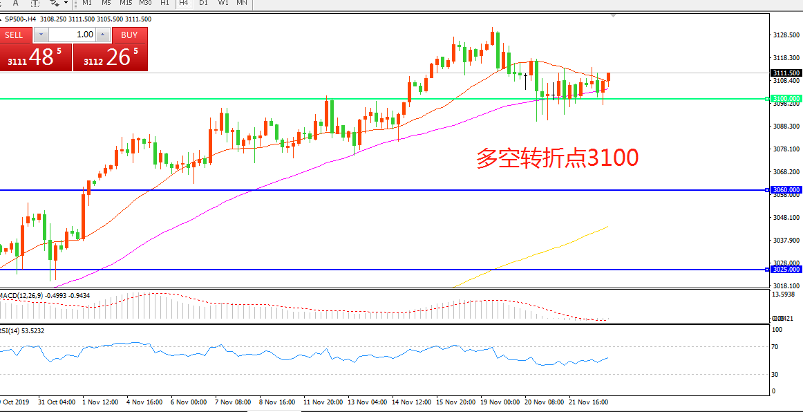 4小时图看,标普500以55周期为短期支撑上行,整体来看依然处于多头趋势,但MACD红柱缩短,RSI指标向上,需警惕短期回落风险。