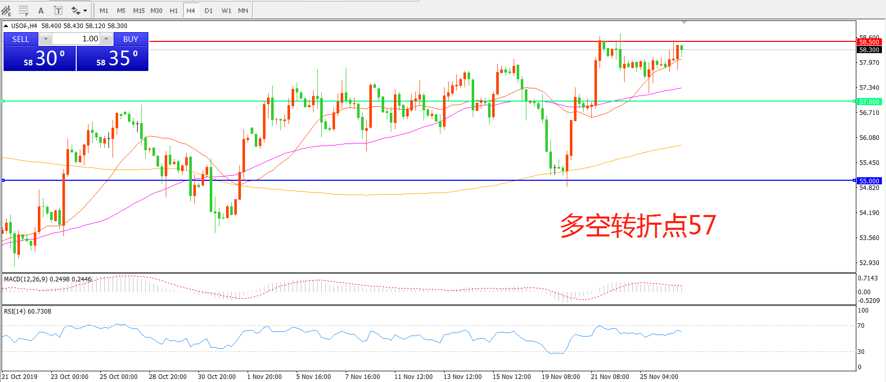 4小时图看,油价以21周期均线为依托震荡走高,短期走势偏强,58.5一线阻力近在咫尺,均线系统呈多头排列,MACD红柱减少,RSI指标走平,如能突破上方阻力,油价可能开启新一轮的上涨。
