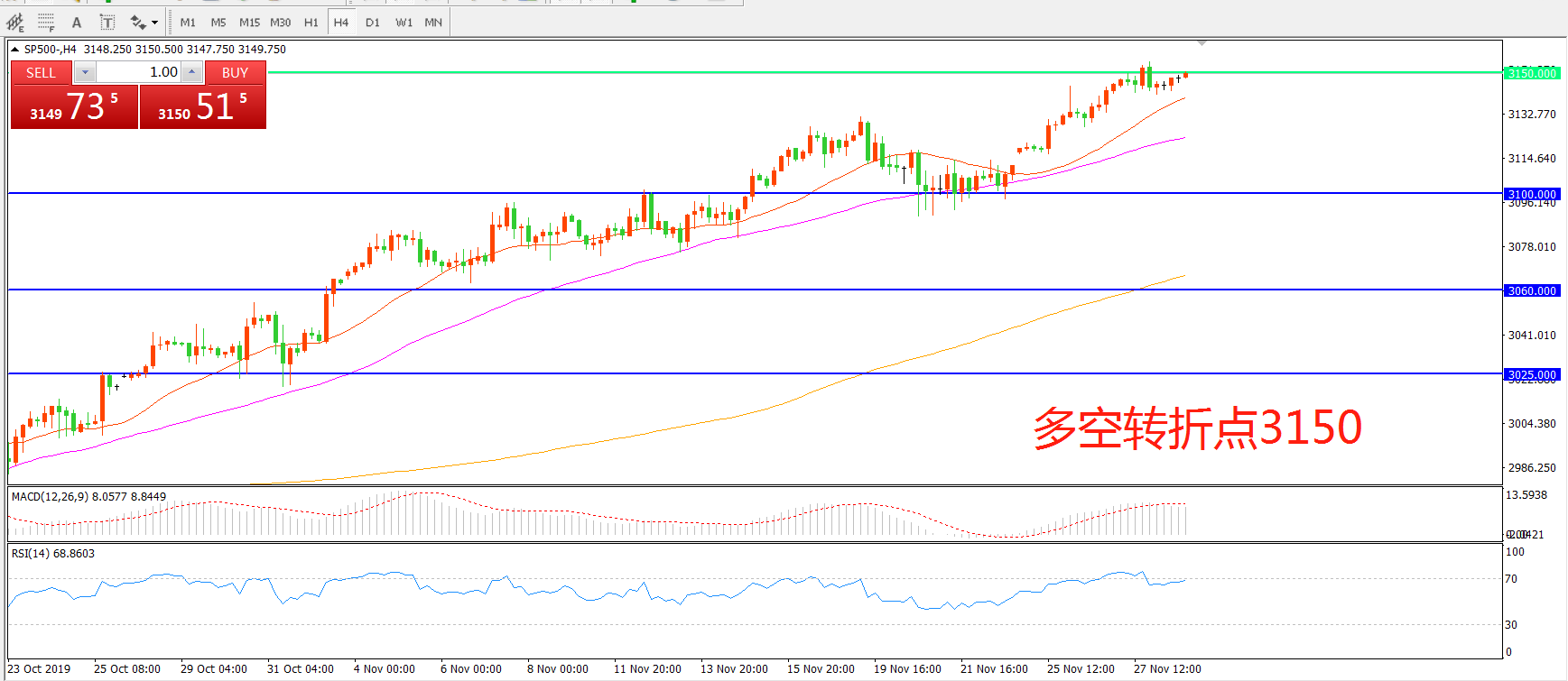 4小时图看,标普500连创新高,多头趋势依然明显,均线系统呈多头排列,MACD红柱增加,RSI指标向上,日内以逢低做多思路为主。
