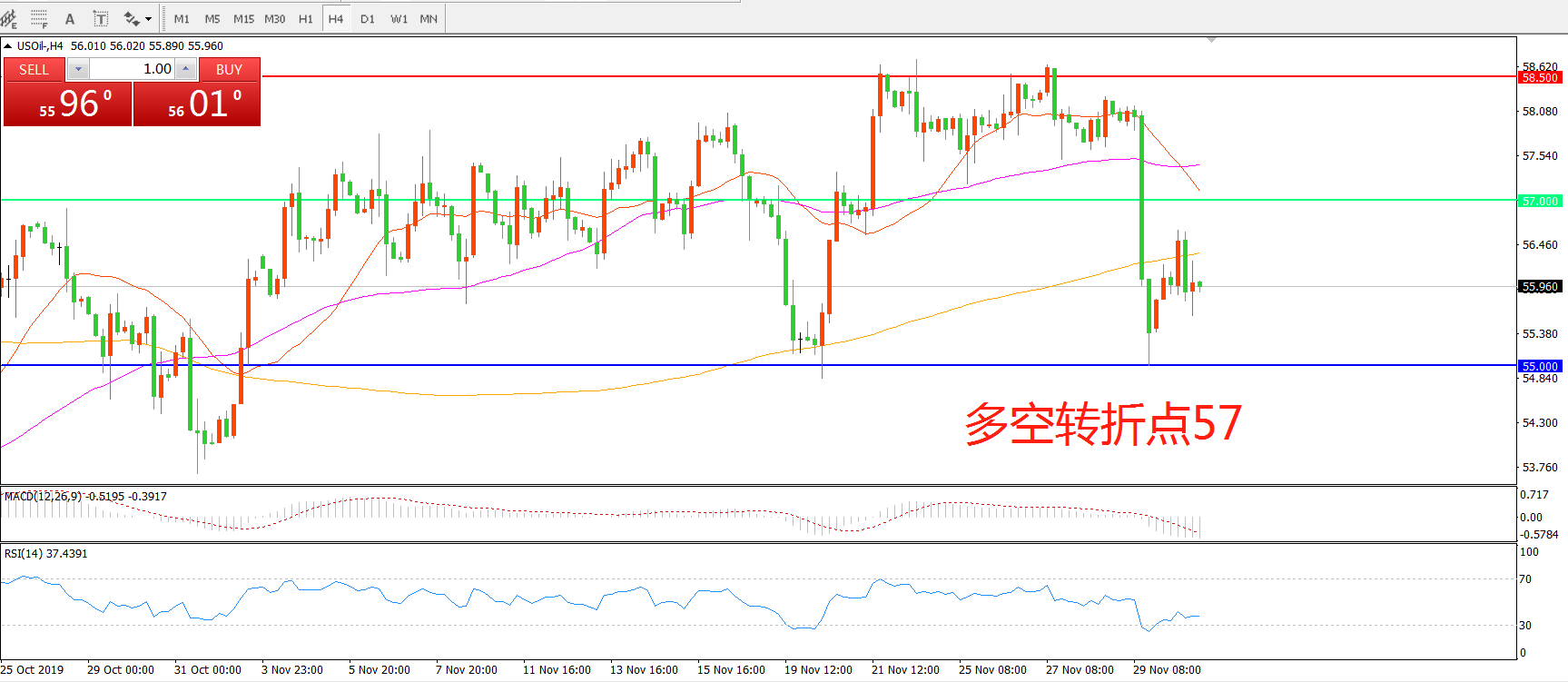 4小时图看,油价触碰55美金一线后小幅反弹,但整体仍在200周期均线之下,MACD绿柱增加,RSI指标向下,日内下行概率较大。