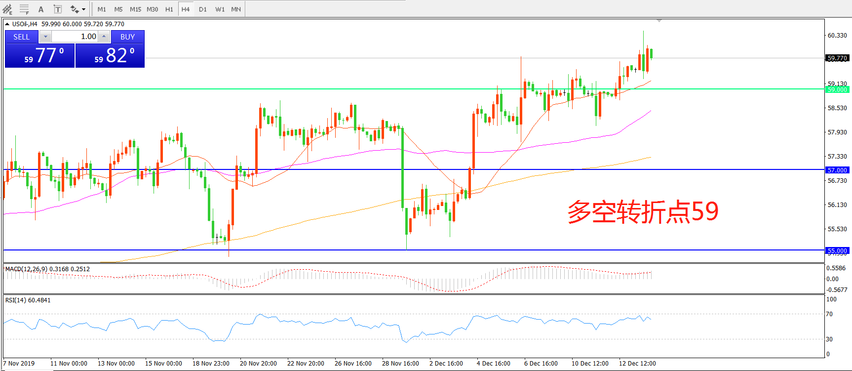 4小时图看,油价连续反弹,整体走势偏强,59美元被突破后,有加速上行的趋势,均线系统呈多头排列,MACD红柱增加,RSI指标走平,日内延续上行概率较大。
