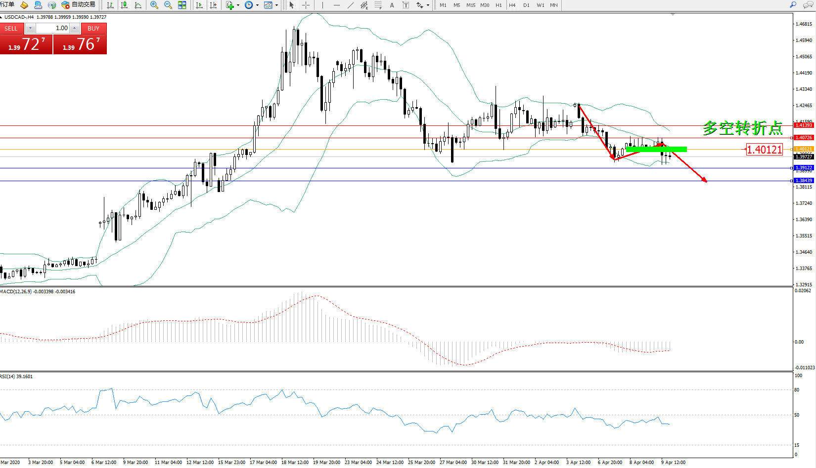 交易策略:1.40121下方看跌,目标1.29122、1.38439