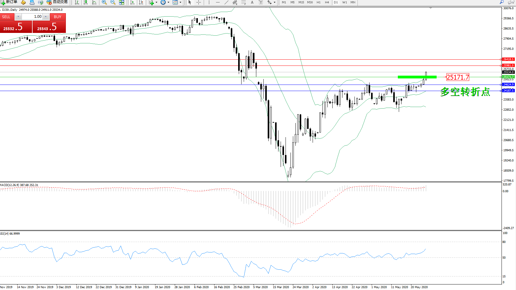道琼斯指数527日(周三)收盘上涨553.20点,涨幅2.21%,报25548.27点。美股集体收涨,金融板块涨幅居前。美联储最新公布的褐皮书报告称,新冠疫情在最近几周严重损害了美国经济,造成“严重”的失业和企业倒闭情况;经济复苏的前景需要一段时间,美联储官员保持宽松政策的可能性也很大,所有区域经济活动均出现下降,且大多数区域急剧下降,反映出新冠疫情造成的破坏。贸易方面的消息已经传出,但由于市场人气仍高企,安全资产并没有从中获得任何好处。随着经济的重新开放提振了乐观情绪,提高了投资者对风险较高资产的兴趣,贸易局势问题已退居次要地位。