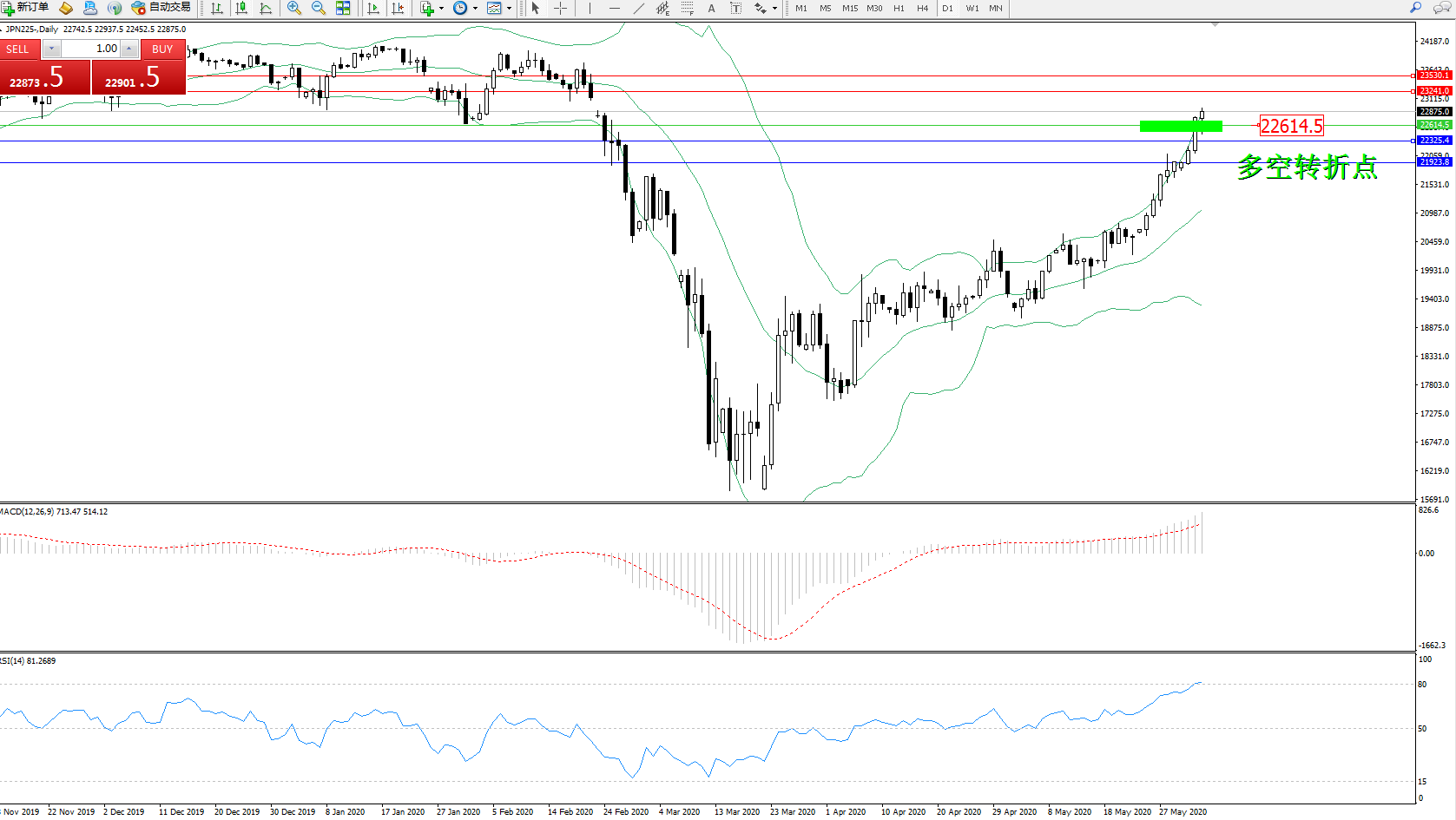 日经225指数63日(周三)收盘上涨293.39点,涨幅1.31%,报22619.00点。日本央行提供800亿日元1年期国债购买;日本央行提供3200亿日元3-5年期国债购买;日本央行提供1200亿日元10-25年期国债购买。市场风险偏好情绪继续回暖,资金纷纷涌入风险资产,全球股市继续集体走高,尽管美国骚乱不停止,但当下复工成全球主题,且经济恢复速度超此前预期,风险市场的好日子仍在继续,尽管涨势强劲,但随着股市本轮涨势范围扩展到美国以外的地区,这种势头很可能会持续下去。