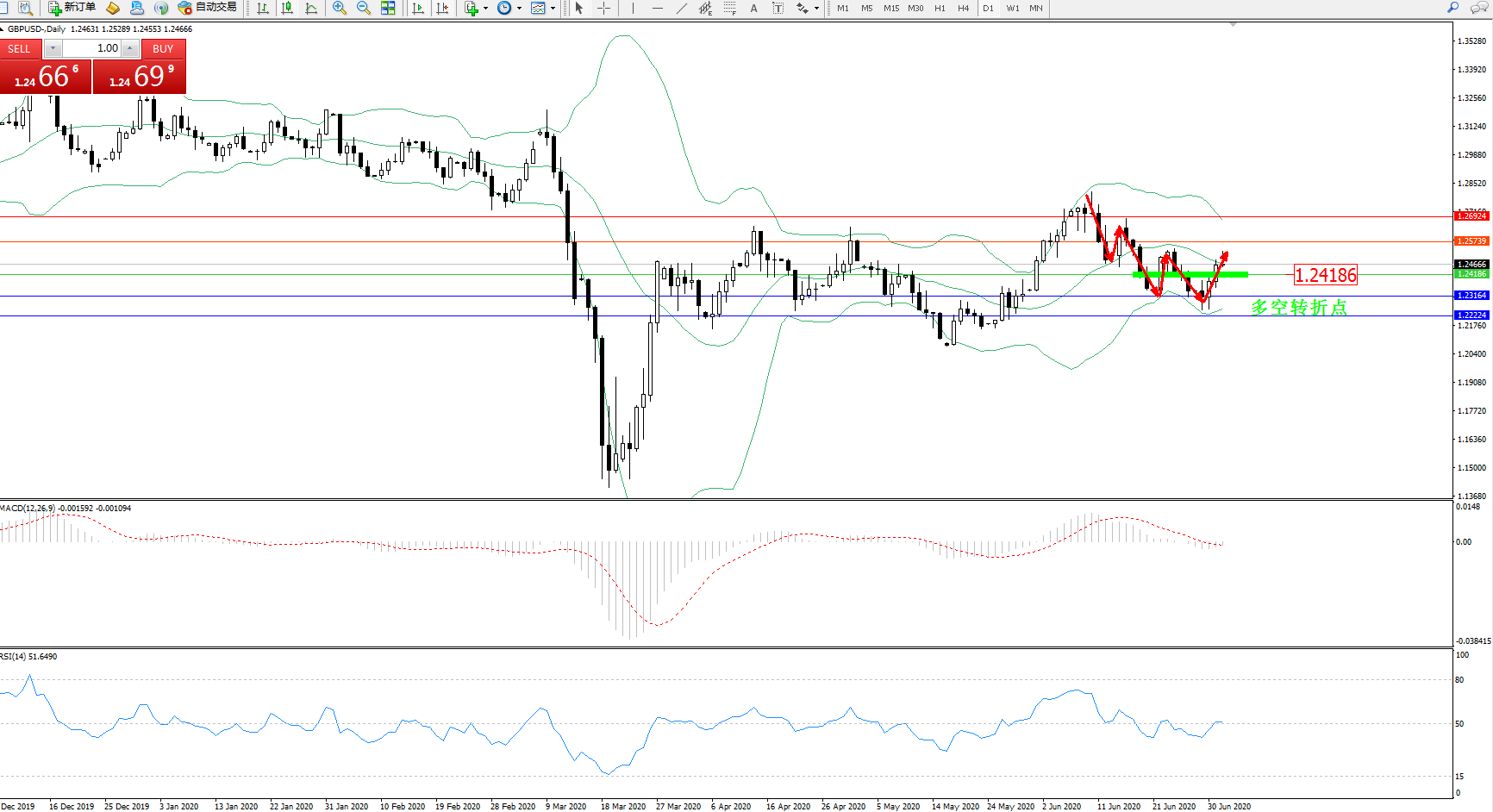 交易策略:1.24186上方看涨,目标1.25739、1.26924