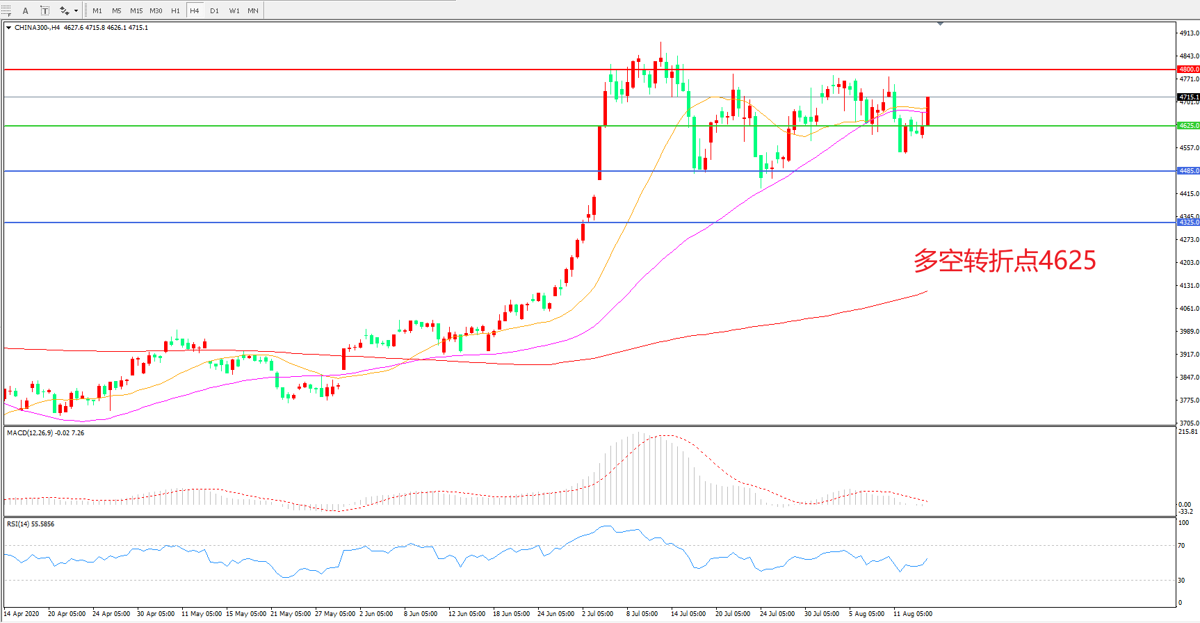 4小时图看,沪深300延续高位震荡,整体波幅有所收窄,4625成为短期支撑,均线系统走平, MACD红柱缩短,RSI指标向上,日内延续震荡概率较大。