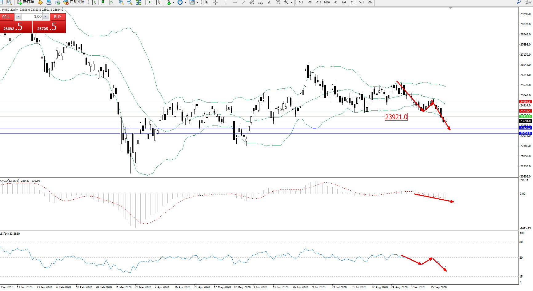香港恒生指数9月23日(周三)收盘上涨25.66点,涨幅0.11%,报23742.51点;港股恒指探底回升弱势收涨,恒生科技指数涨0.9%。恒指午盘走势较稳,在23700点关口徘徊,目前24000点以下已经处于长期估值较低水平,国际金价创逾一个月低位,黄金股延续跌势;大型科技股造好,美团涨3%,小米涨2%,京东、阿里、腾讯皆有涨幅。农夫山泉大涨7%逼近新高,钟睒睒再超马化腾登顶中国首富;乐享互动首日上市跌6.25%。今日南下资金净流入25.86亿港元,大市成交额不足千亿港元。近日美元指数持续走强,今日盘中一度涨至94.258,创7月28日以来新高。港股近期明显缺乏动力,除了因为美股回吐外,目前市场资金走入新股资金冻结期,市场或暂时缺乏流动性。,港股或再跌至22800才出现反弹。此轮跌市以「阴跌」为主,如要止损的投资者切勿因「阴跌」而心软。