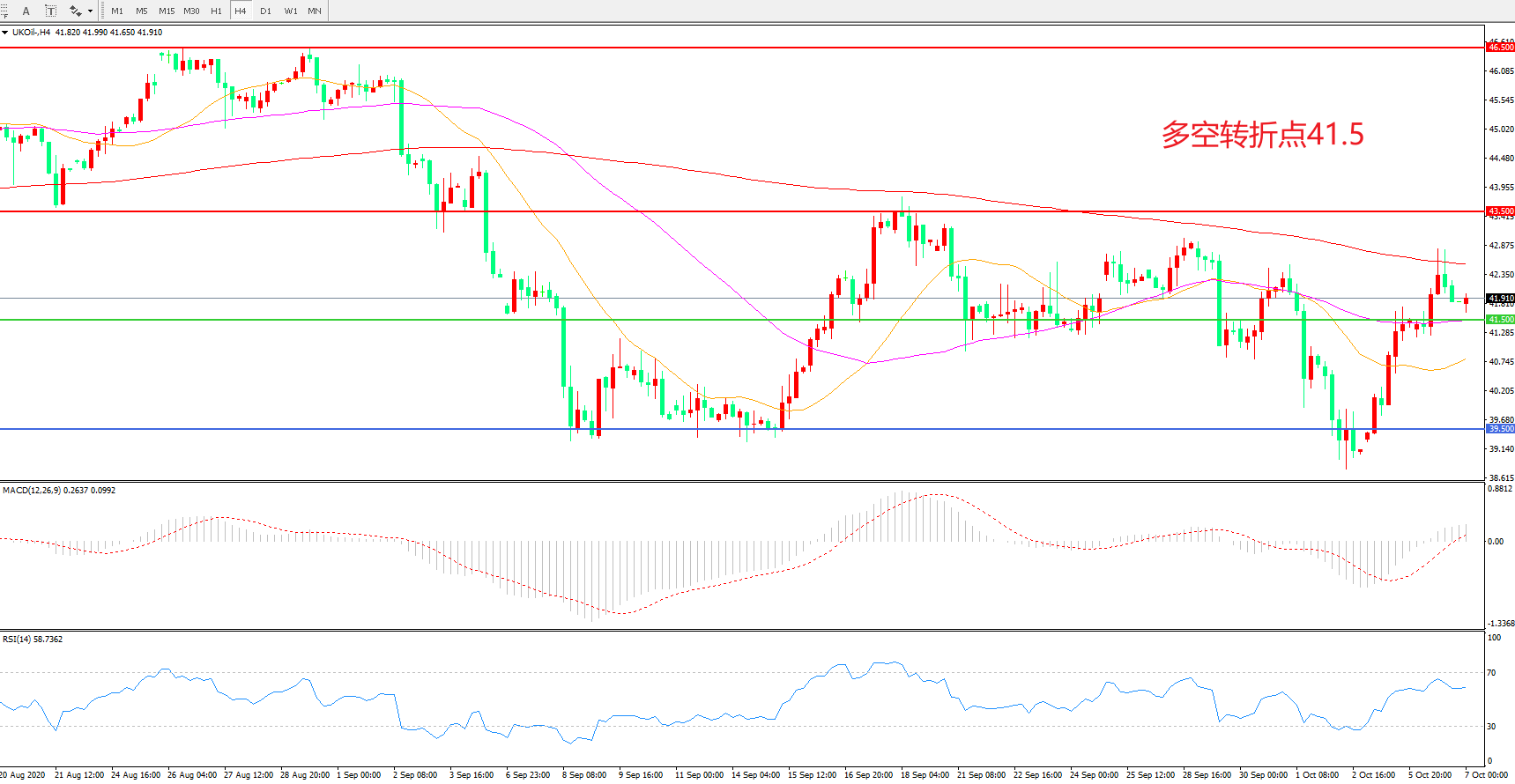 4小时图看,油价一度突破200周期均线后震荡回落,短期走势陷入震荡,41.5成为近期多空分水岭,MACD红柱增加,RSI指标走平,日内延续震荡概率较大。