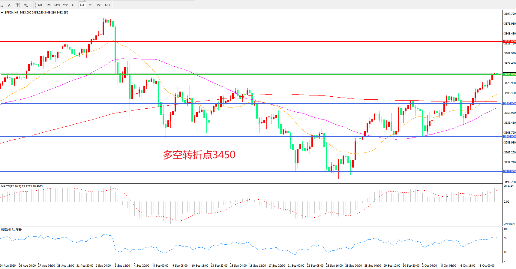 周四(10月8日),美股依然关注国会新一轮财政刺激计划谈判的消息,特朗普发表讲话,声称谈判已经重新开始,政府和民主党“进行了一些非常富有成效的会谈”,标普500大幅上行后收报3454.50点。