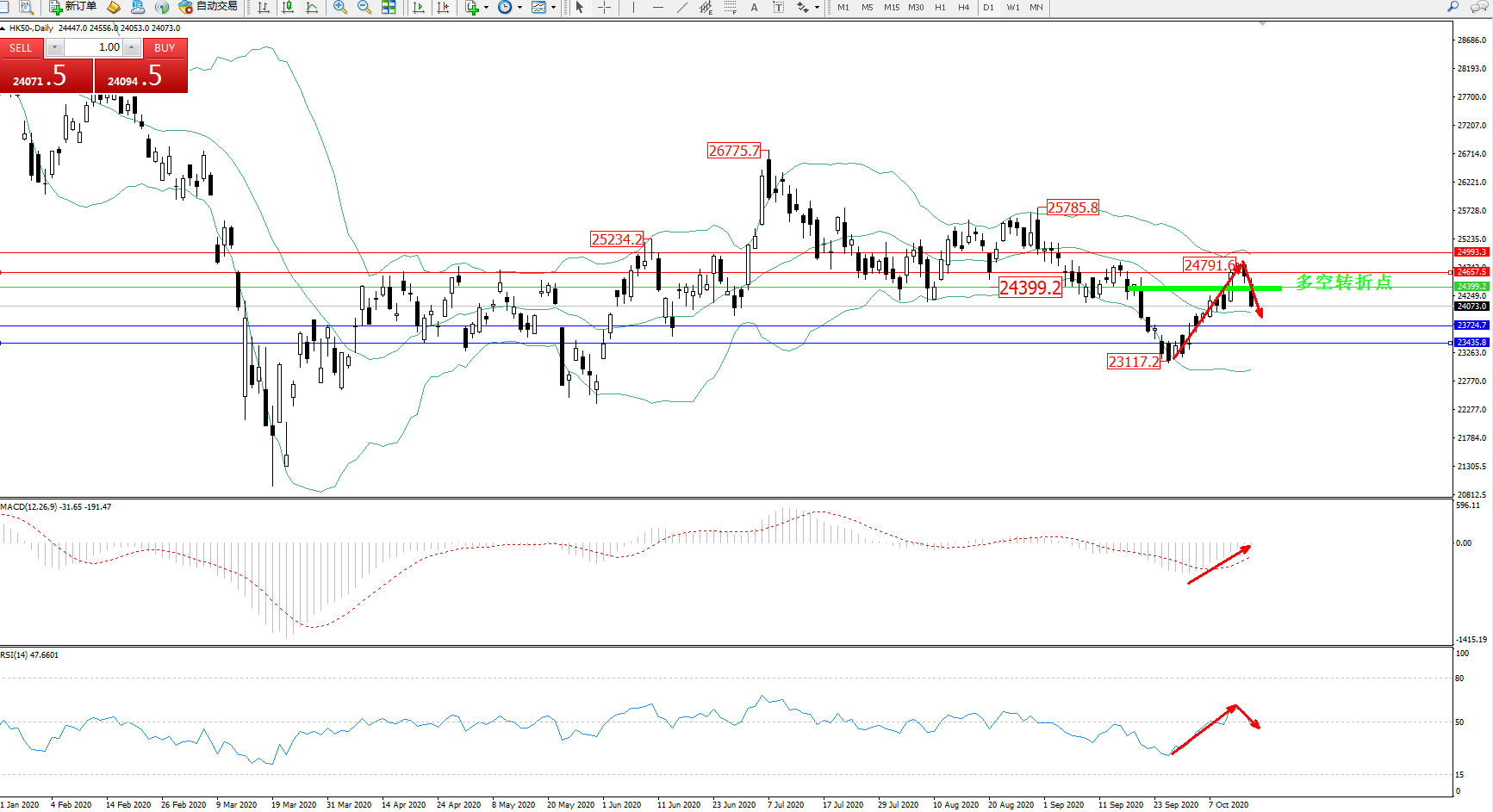 香港恒生指数10月15日(周四)收盘下跌508.55点,跌幅2.06%,报24158.54点;港股主要指数均呈单边下跌行情,欧美市场跳水,美国三大股指期货跌幅扩大,纳指期货跌1%,标普500指数期货跌0.55%,道指期货跌0.5%。恒指尾盘跌幅扩大至超2.2%,科技股大跌,致恒生科技指数大幅下挫3.57%。盘面上,大型科技股领跌大市,美团跌4.8%,阿里跌4.3%,小米、京东、腾讯皆跌逾3%;药品股板块跌幅居前,香港本地股普跌;风电股继续强势,新能源汽车股高开低走,比亚迪股份尾盘转跌。捷心隆首日上市大幅收涨213.89%。今日南下资金逆势净流入45.88亿港元,大市成交额为1305亿港元。香港联合交易所有限公司于10月5日发布了《于2020年10月19日推出优化开市前时段》的通告,开市前时段优化将于2020年10月19日推出。此外,提示投资者注意,对于适用开市前时段的港股通股票,根据联交所业务规则,开市前时段的买卖申报将受到价格限制,投资者应当关注因此可能产生的风险。