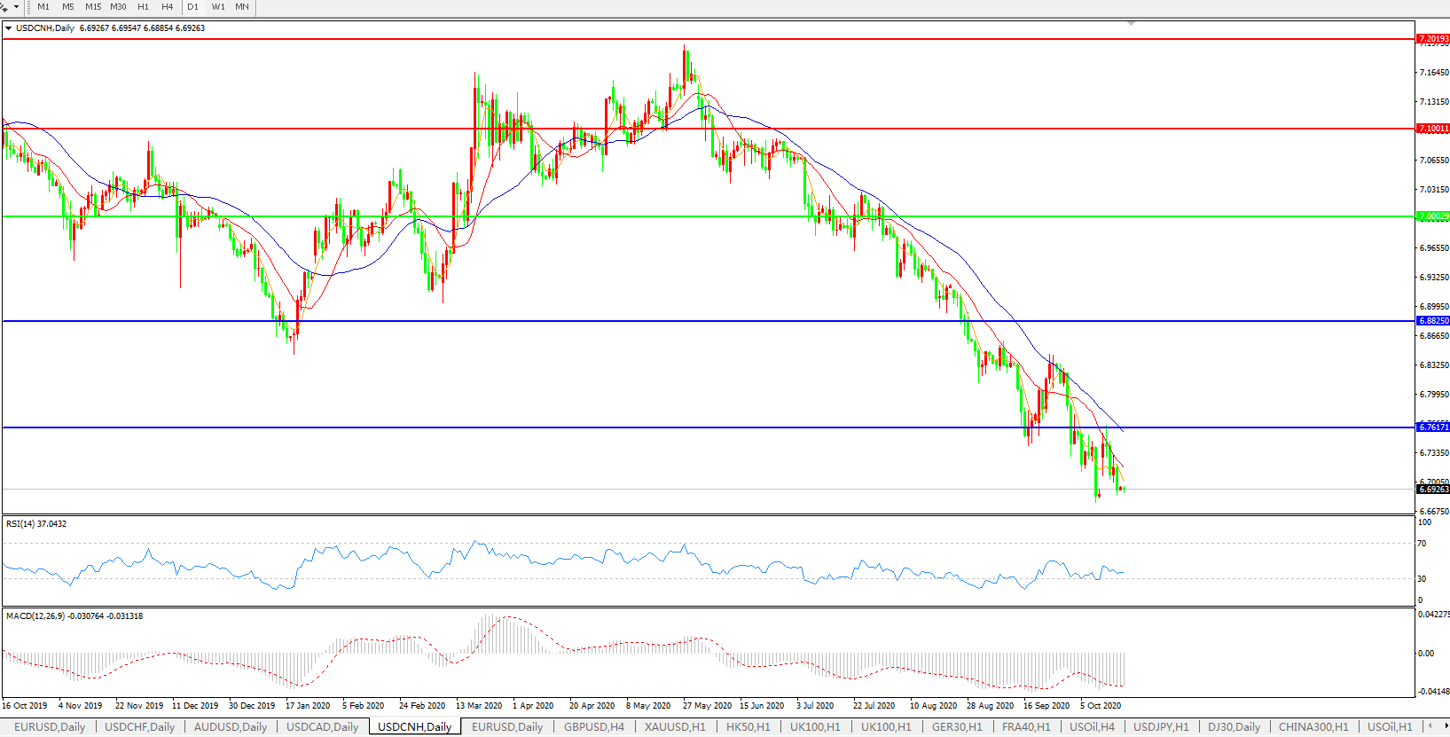 美元兑人民币USDCNH 日线图: