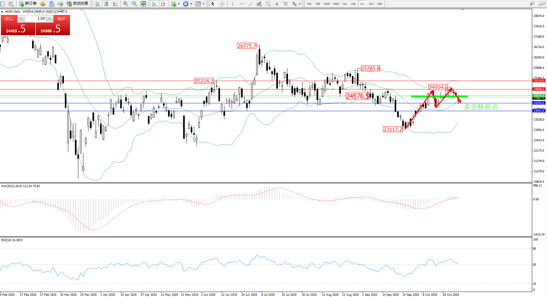香港恒生指数10月29日(周四)收盘下跌122.20点,跌幅0.49%,报24586.60点;港股主要指数均呈低开高走态势,恒指午后近乎翻红,恒生科技指数涨0.25%。大型科技股美团收涨超6%创新高,腾讯亦再度破顶;猪肉概念股跌幅居前,保险股、电信股、濠赌股全天弱势。今日南下资金大幅净流入115.07亿港元,大市成交额为1331.86亿港元。隔夜美国众议院议长佩洛西和财政部长姆努钦的谈判再度无果,且欧美疫情导致新增病例数激增,美国三大股指纷纷大跌,港股正在进行由价值向成长的蜕变。恒指估值提升也将是未来主旋律。港股估值或进一步向美股靠拢,提升整体中资股票在全球的吸引力,增加海外资金对中国市场的配置比例。在美元长期走弱背景下,人民币资产的配置价值进一步凸显。