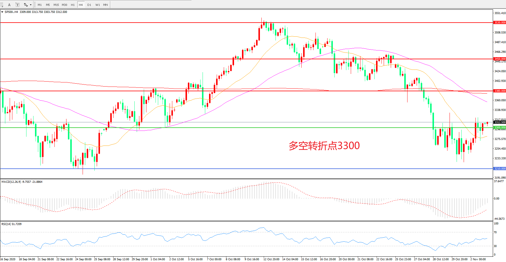 4小时图看,标普500延续低位震荡,整体波幅不大,3300成为多空分水岭,均线系统逐渐走平,MACD绿柱缩短,RSI指标走平,日内延续震荡概率较大。