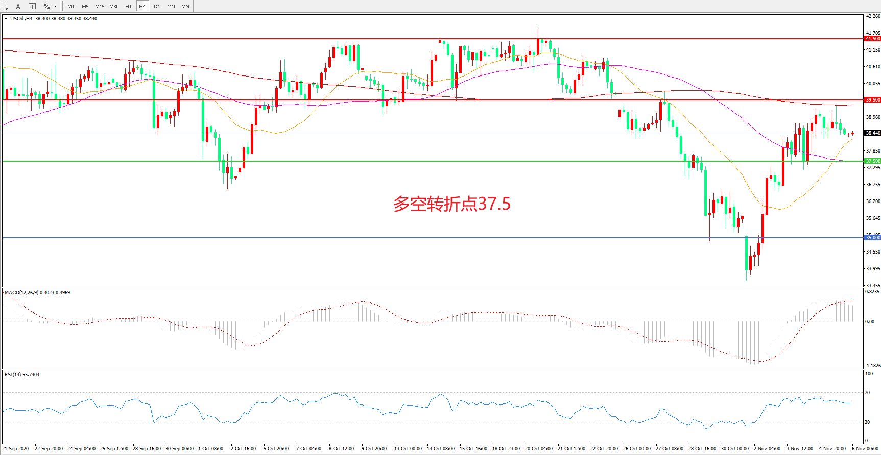 周四(11月5日),美国EIA数据大幅减少799.8万桶,远超市场预期,油价一度大幅冲高,但获利回吐盘似乎逐渐出现,使得反弹失去动力,美国WTI原油震荡下行,收报38.38美元/桶。欧洲疫情防控措施升级,法国、意大利和西班牙的平均高速公路使用量降至6月底以来的最低水平,这可能会给OPEC+施加压力,迫使其推迟1月的增产计划。