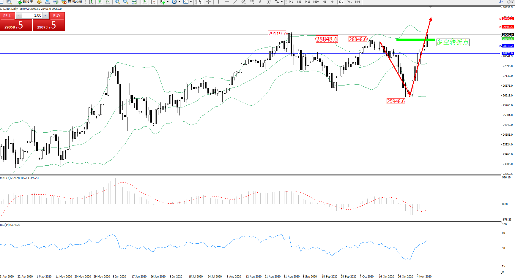 交易策略:28848上方看涨,目标29402、29790