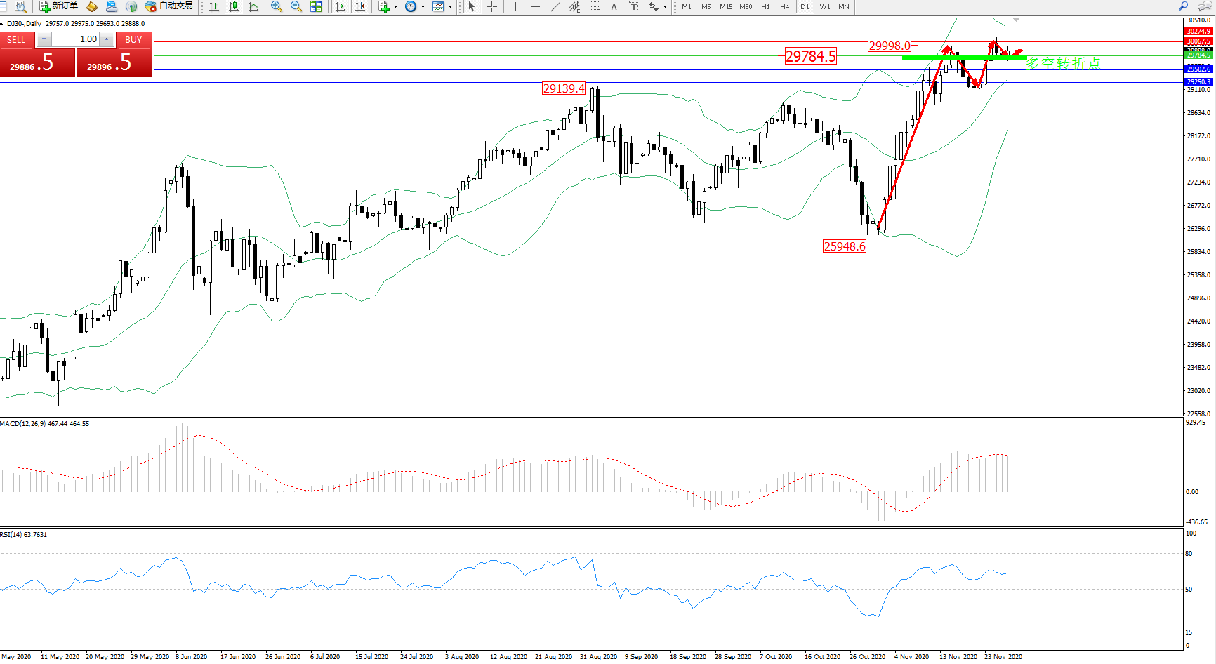 道琼斯指数11月27日(周五)收盘上涨37.90点,涨幅0.13%,报29910.37点。美股三大指数集体收涨,美国股市在假期后清淡交投中创下纪录新高。11月份累计攀升11%。全球股市本月有望创下纪录最佳表现,攀升13%,并使估值升至接近20年来的最高水平;政治确定性也推动了风险资产这个月的表现,候任总统拜登继续他的过渡进程。新冠疫苗捷报频传,市场对美国经济将在疫苗接种的推动下迅速复苏以及白宫平稳过渡的乐观情绪日益增强,长期美债收益率继续下跌,投资者考虑美联储在下次会议上延长购买较长期国债的可能性。下周将有大量美国经济数据出炉,其中包括11月非农就业数据,这可能强化对美国经济复苏受挫的预期,因有几个州为防止病毒蔓延而实施封。