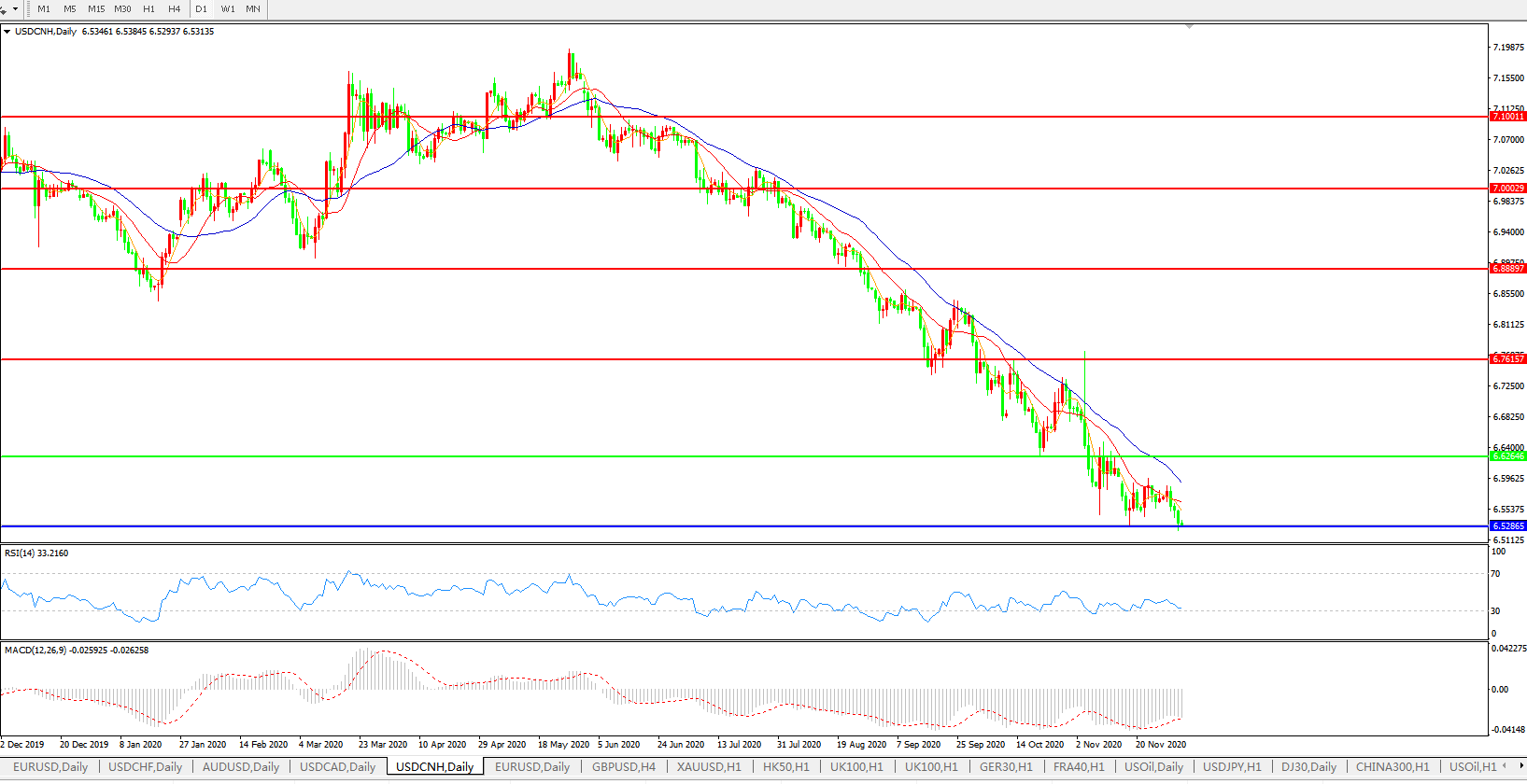 美元兑人民币USDCNH 日线图: