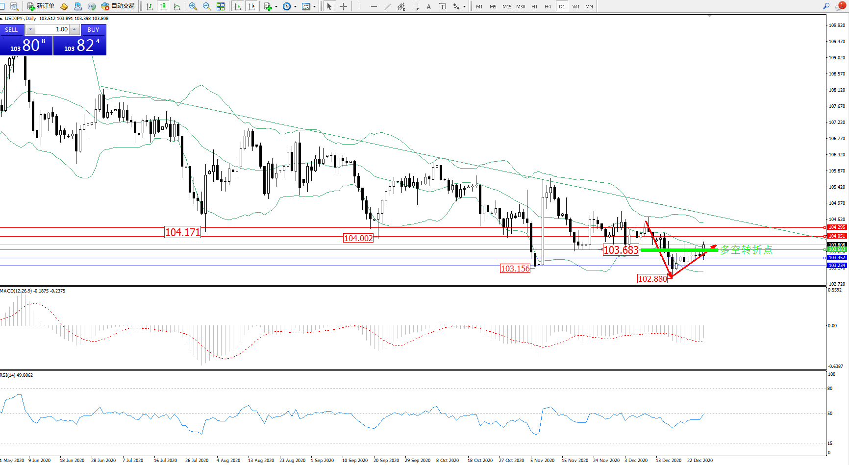 技术点评:空头动力延续布林带指标通道内维持震荡下行后,底部抵达102.880位置后开始反转向上移动,突破布林带指标中轨附近节点后有继续上移态势,布林带指标呈收口走势持续中,关注中轨下方附近节点,MACD指标处于0轴线下方空头区域位置整理平缓向上移动中,RSI指标底部维持震荡上移至50均衡线附近徘徊;